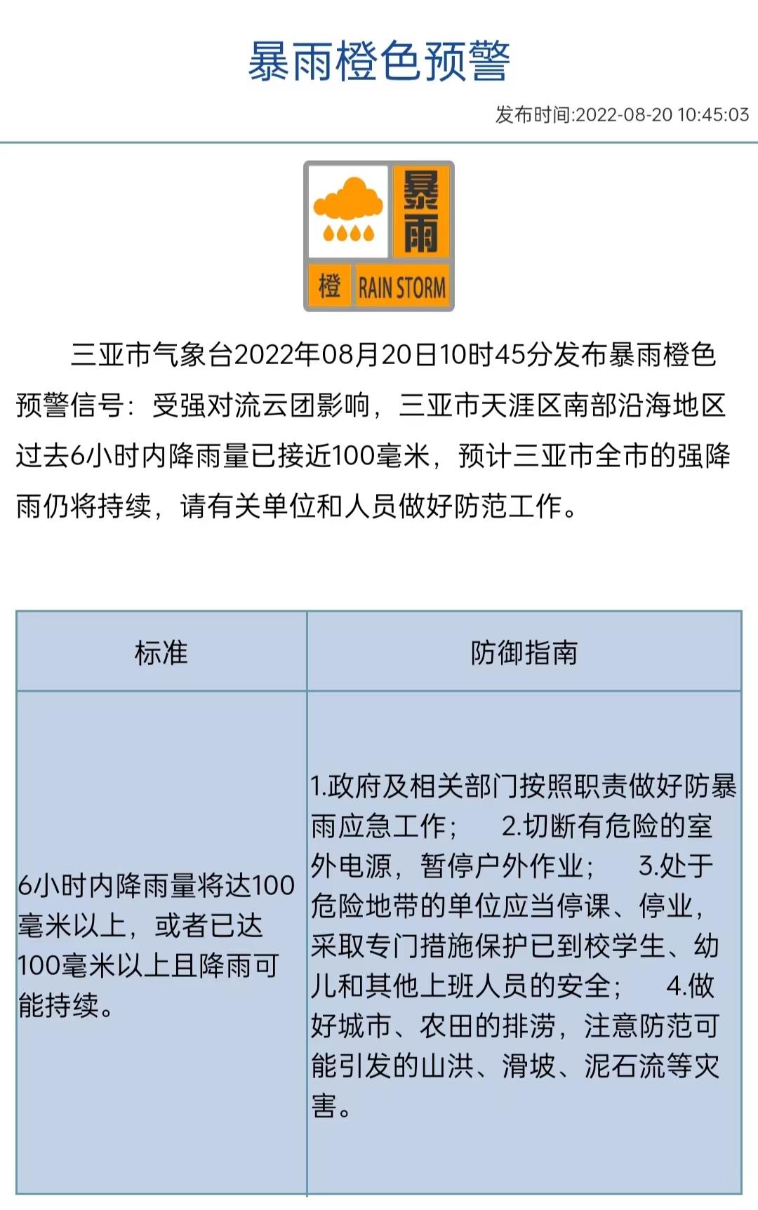 記者從海南三亞氣象部門獲悉,受強(qiáng)對(duì)流云團(tuán)影響,三亞市天涯區(qū)南部沿海地區(qū)過去6小時(shí)內(nèi)降雨量已接近100毫米 ,預(yù)計(jì)三亞市全市的強(qiáng)降雨仍將持續(xù)。三亞市氣象臺(tái)2022年8月20日10時(shí)45分發(fā)布暴雨橙色預(yù)警信號(hào) ,請(qǐng)有關(guān)單位和人員做好防范工作 。